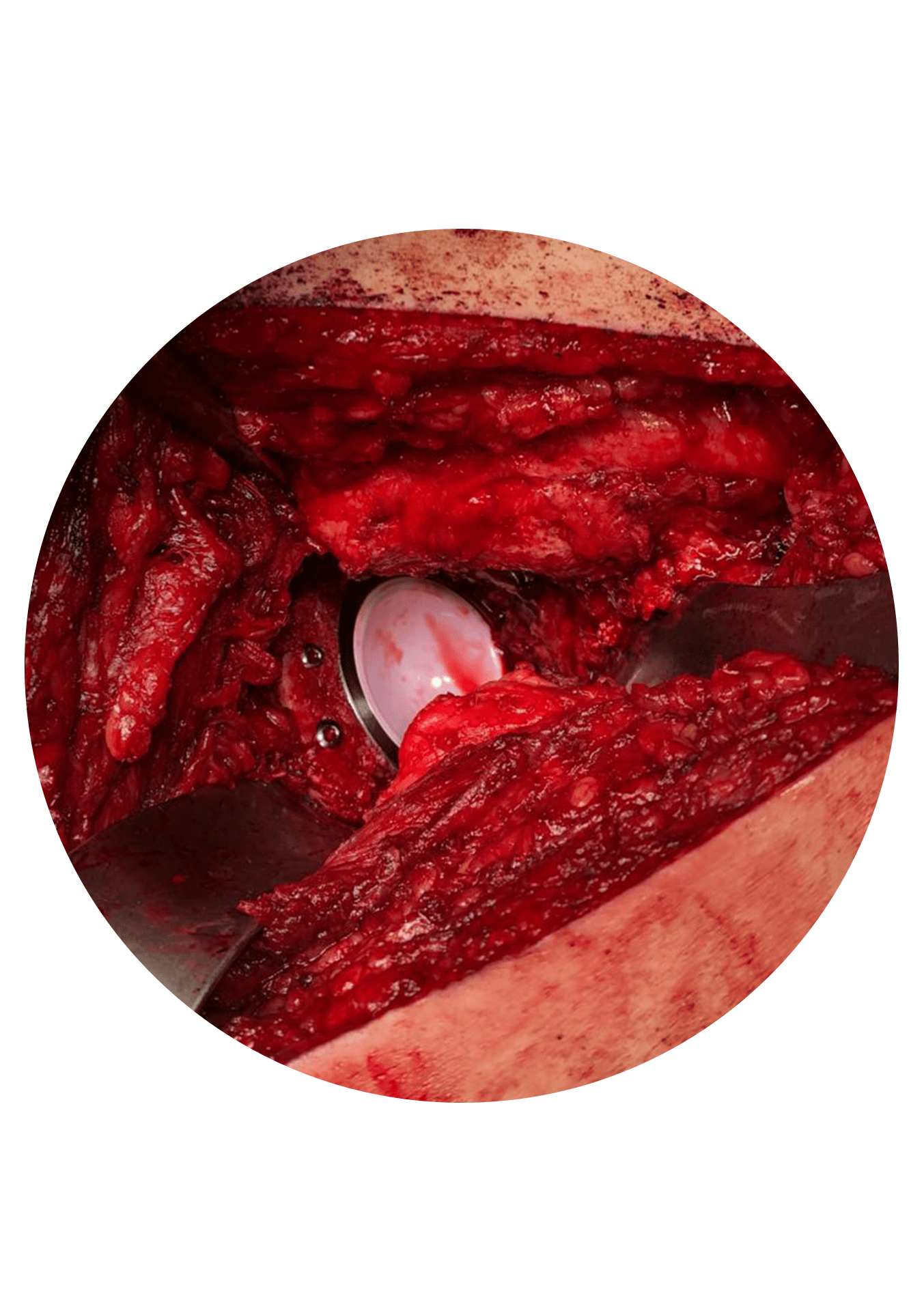 Primeiro: remoção do implante(s) deficiente(s) e preservação dos implantes competentes. Este é muitas vezes o momento mais complexo da cirurgia de revisão. O seu objetivo principal é remover apenas os implantes que precisam de ser substituídos e neste processo causar a menor lesão possível na estrutura óssea da articulação para facilitar a fase seguinte.